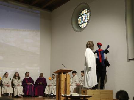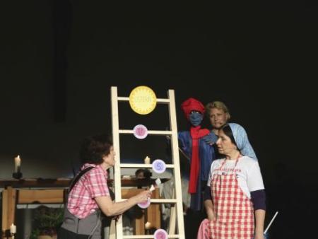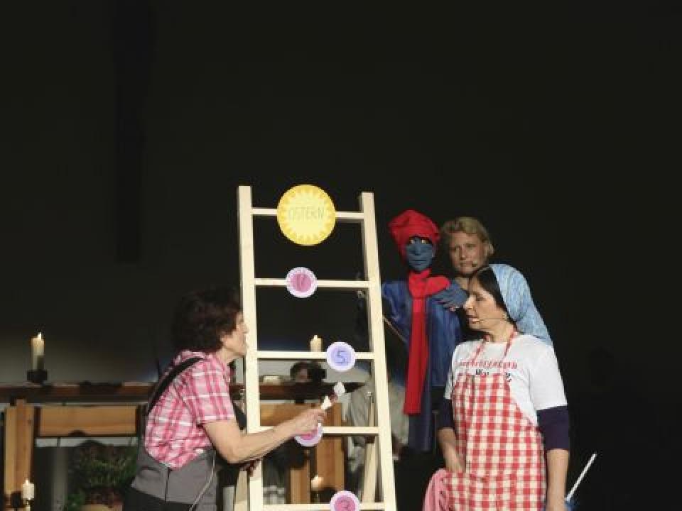 Denn ein Teufelchen in Form einer Handpuppe versuchte Klein und Gross von den guten Vorsätzen, ja vom guten Weg abzubringen. Sogar bei Jesus selbst probierte der Teufel sein Glück: „Verwandle diese Steine in Brot!“; „Werfe Dich vor mir nieder!“ „Stürze dich von der Tempelmauer!“ Aber Jesus blieb souverän – gegen sein Vertrauen in Gott hatte der Teufel keine Chance.
