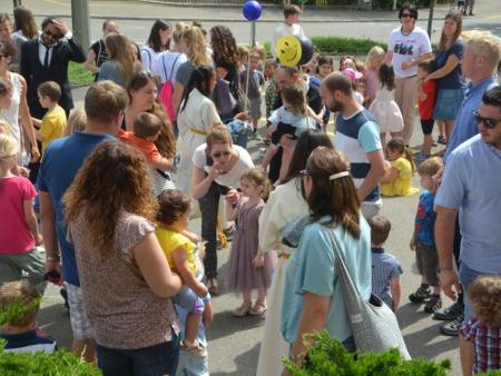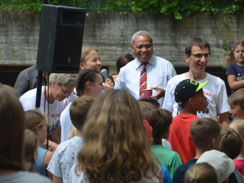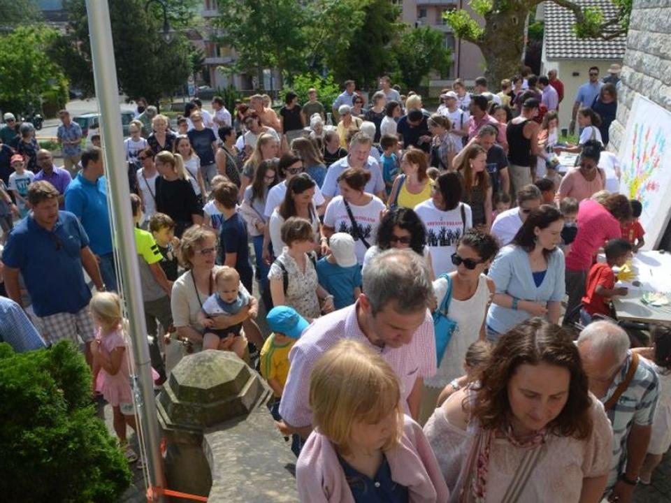 Das Wetter passte wunderbar und alle waren gut gelaunt. Vor dem Gottesdienst fand man sich vor der Kirche ein. Verschiedene Stände wurden betrieben, man begrüsste sich, es gab Kaffee & Kuchen und rasch warfen noch einige ihren Wettbewerbstalon in die Urne. An den zwei «Türsteher» traute sich niemand vor dem Glockenläuten hinein in die Kirche. Diese war erfreulicherweise dann sehr gut besucht und der Gottesdienst war locker gestaltet. Die Musik mit Generationenchor und Begleitung passte ideal und bei den gewählten Liedern konnte von den Leuten gut und gerne mitgemacht werden.