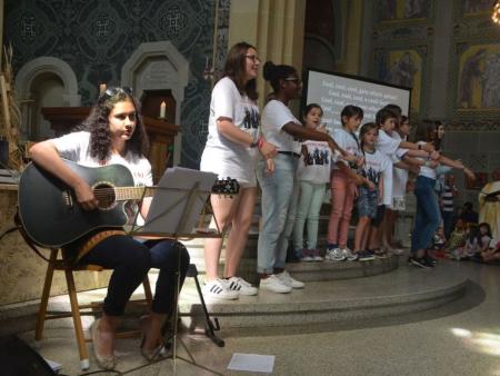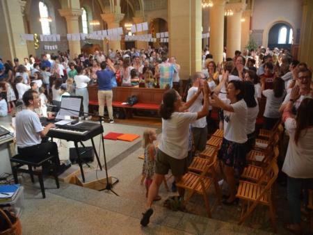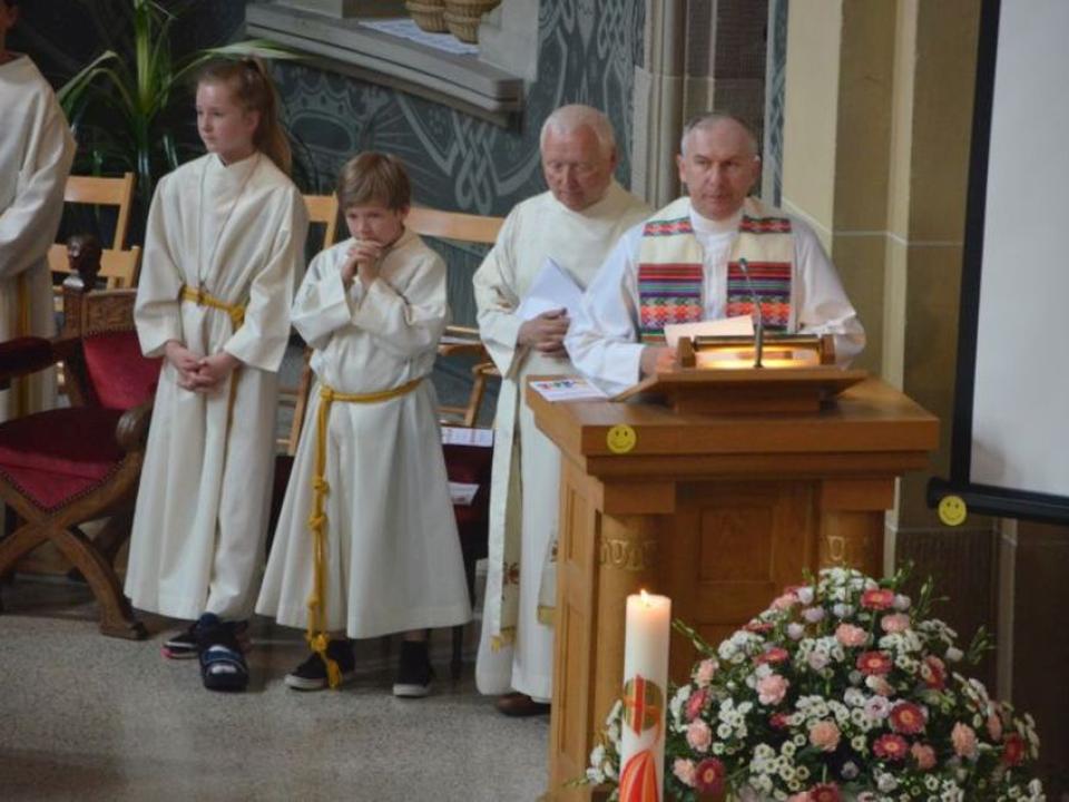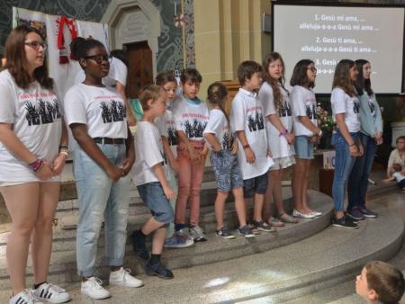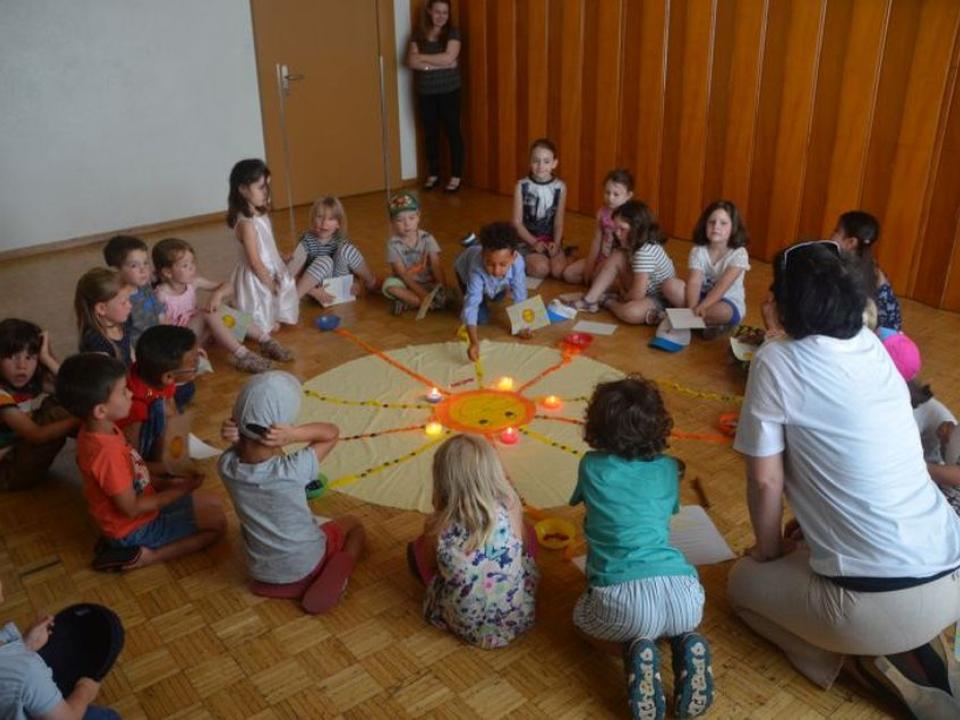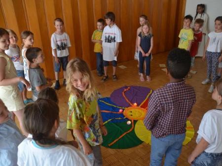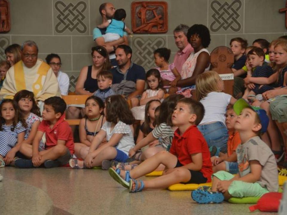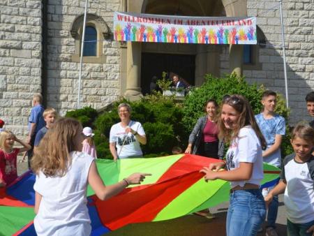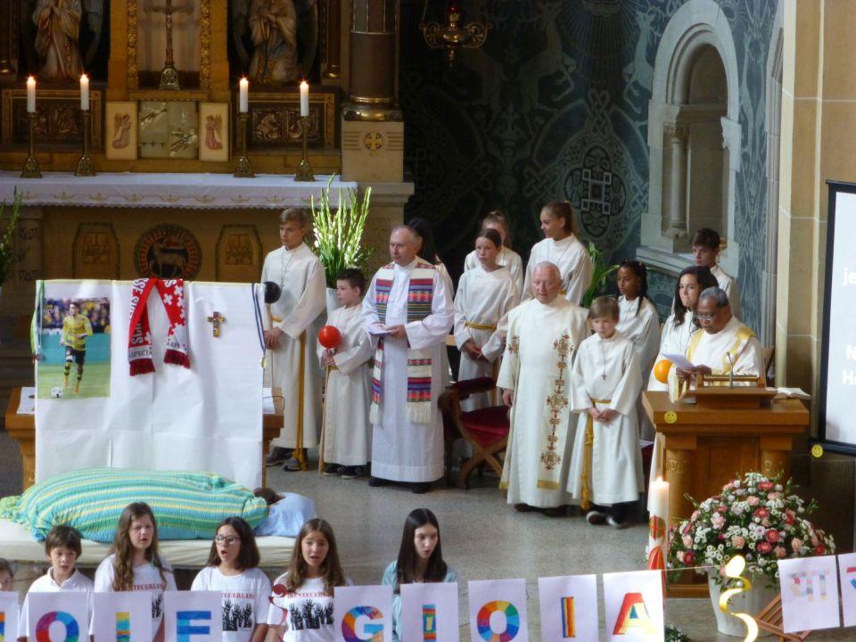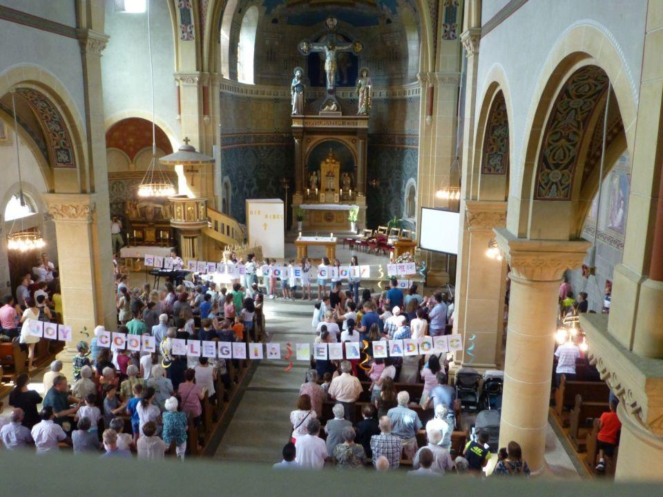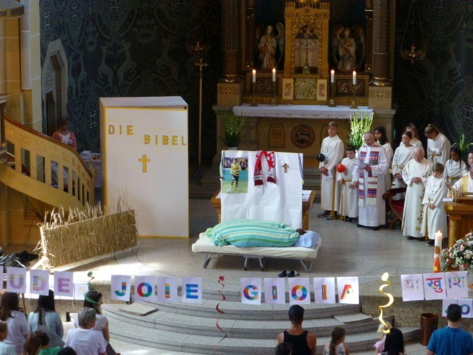 Die Kinder wurden nach einer witzig wahren Einleitung eingeladen, sich ins Abenteuerland (nebenan ins Pfarreizentrum) zu begeben. Dort wurde von den Begleiterinnen nach unterschiedlichem Alter eingeteilt und entsprechend gestaltetes Vertiefungsprogramm zum Thema Freude durchgeführt. Nach einer Weile wurde die Kinderschar für gemeinsames Ausklingen wieder in den Gottesdienst gebracht.