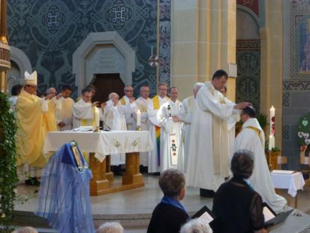 „Die ganze Kirche stimmt heute, am Dreifaltigkeitssonntag, ein in das grosses Halleluja“, so begrüsste Bischof Felix Gmür die grosse Gemeinschaft von Gläubigen, die Joachim Cabezas begleiten und mittragen wollte bei diesem wichtigen Schritt der Priesterweihe. Gekommen waren sie von nah und fern, Familienmitglieder aus Spanien genauso wie Freunde und Seelsorge-Kollegen der verschiedensten Wirkungsorten des Priesteramtskandidaten. Eindrücklich kam das „Hier bin ich“ Joachim Cabezas über die Lippen, als Bischof Felix den Kandidaten aufrief. Eindrücklich waren die Klänge der „erdwärtsmesse“, die der Kirchenchor Neuhausen, begleitet von Bläsern und Orgel, unter der Leitung von Roberto Alfarè ertönen liess. Eindrücklich stimmte die versammelte Gemeinde immer wieder in den Gesang ein. Die Kirche Heilig Kreuz Neuhausen erlebte mit dieser Priesterweihe einen grossen Tag, an den sich nicht nur der Priester Joachim Cabezas gern und mit Freuden erinnern wird. Das zeigte sich schon an seiner ersten Reaktion am Ende des Gottesdienstes, als er sagte: „Diese Gemeinschaft hier erfüllt mich mit tiefer Dankbarkeit.“