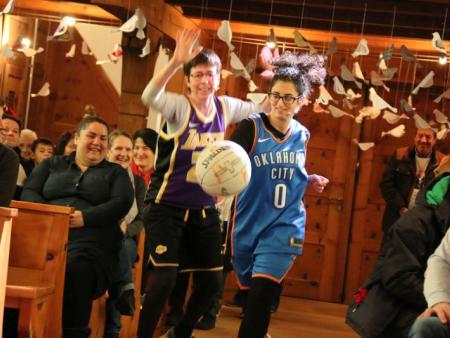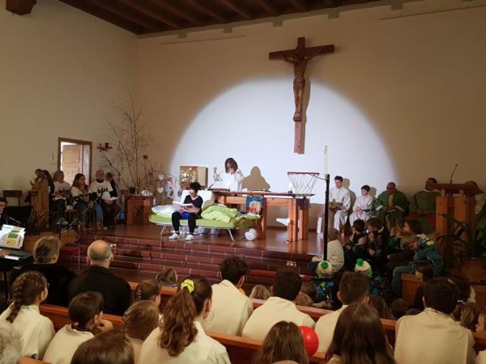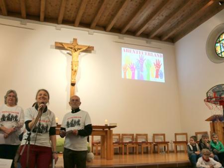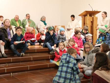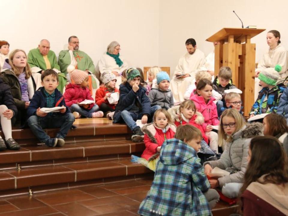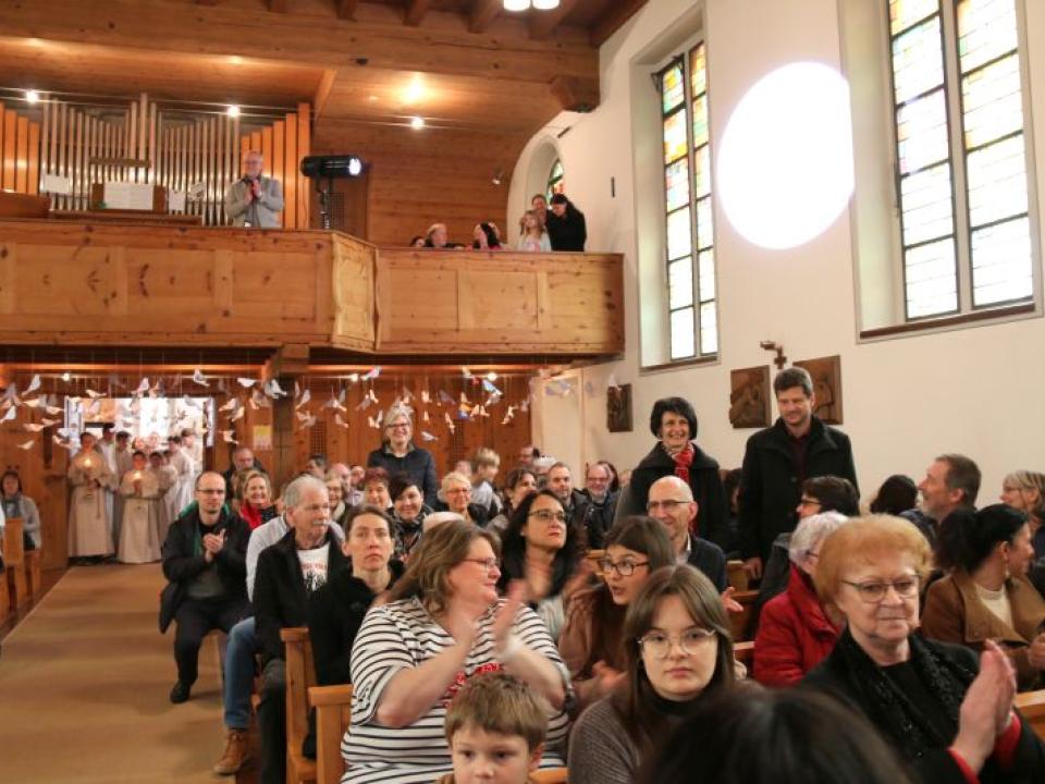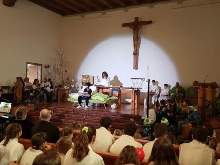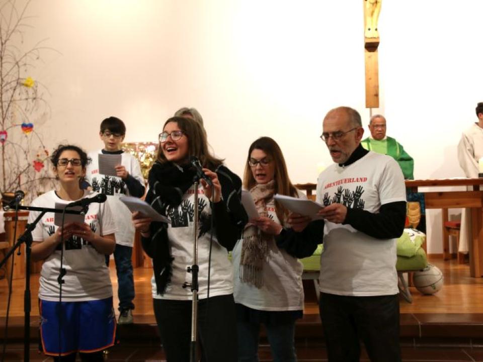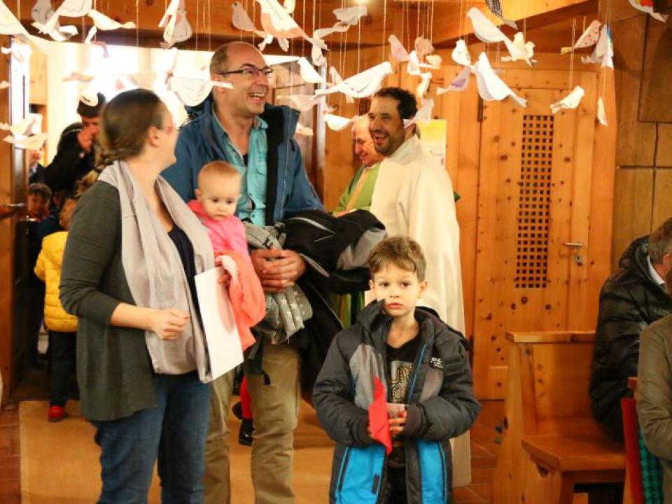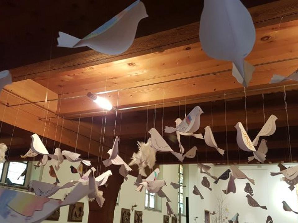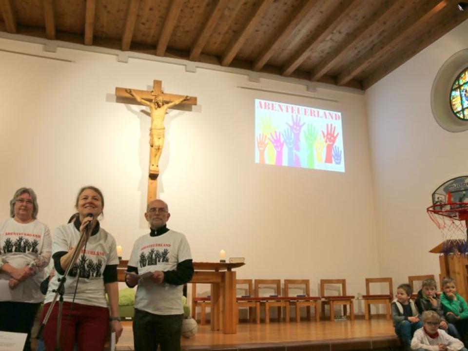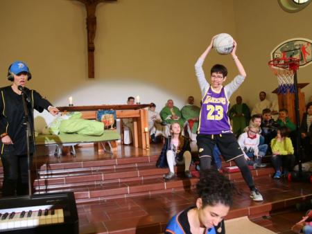 Im Hallauer Kircheneingang hingen dutzende Tauben am „Himmel“ und wiesen schon symbolisch auf das Abenteuerland-Thema „Frieden“ hin. Im Anspiel beim Basketballeinsatz verdeutlichten die Spielerinnen, wie unfairem Spiel auch begegnet werden kann - nicht mit Wut und weiterer Unfairnis, sondern eher mit Versöhnung. In altersgerechten Gruppe wurde von zahlreichen Kindern das Gesehene und Gehörte reflektiert, während in der Kirche die Anwesenden der Predigt von Pastoralraumleiter Josif Trajkov lauschten.